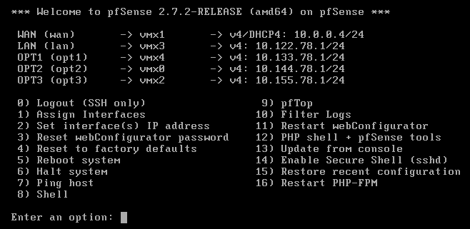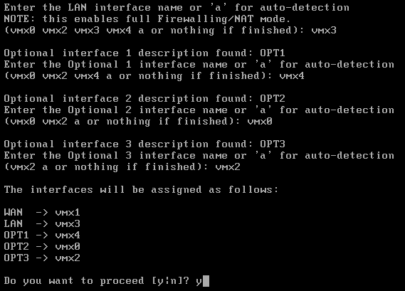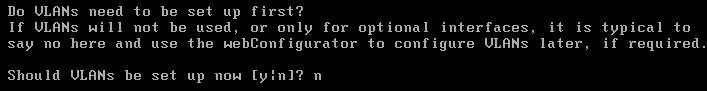 On startup pfSense will ask if you would like to set up VLANs proceed with n or no: